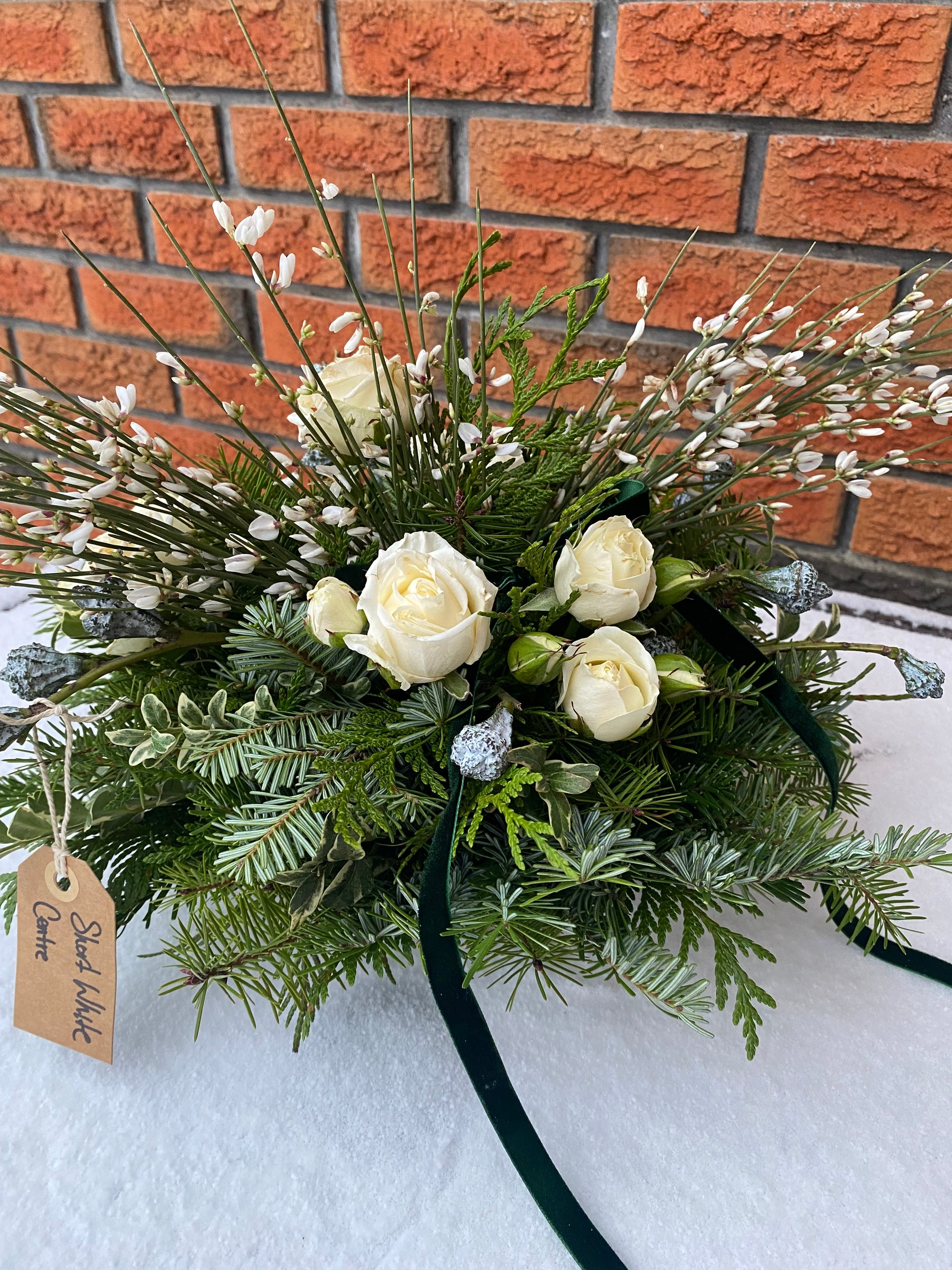 A natural, grounded arrangement made with seasonal evergreens and soft winter florals. Designed to feel warm, simple, and inviting — the perfect touch for holiday tables, coffee tables, or gift-giving.